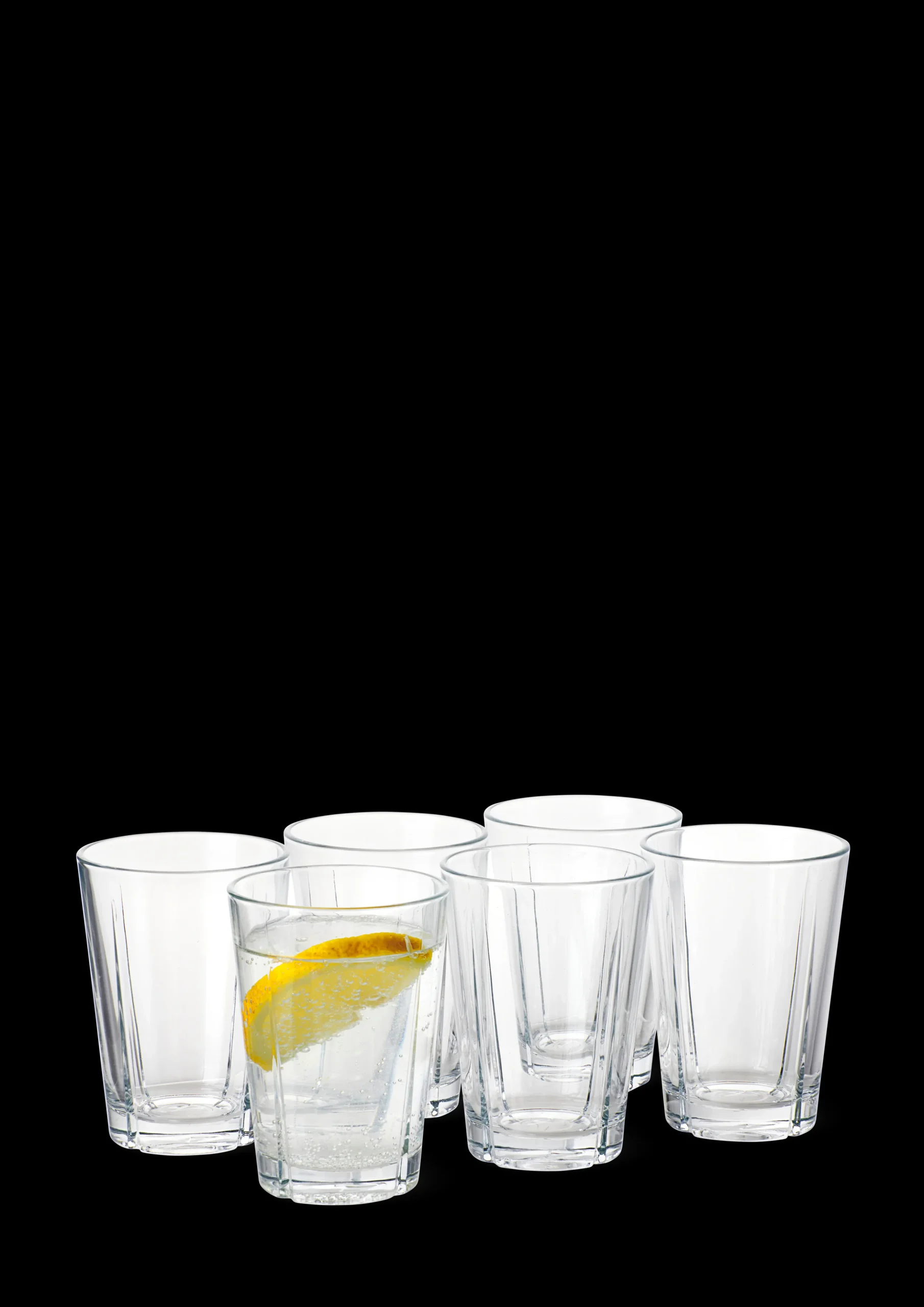 Disse vandglas er blevet meget populære Ikke mindst på grund af det enkle design, størrelsen og grebet. De er robuste og lette at stable i skabet. Brug dem også til servering af mindre forretter og små salater. De rene linjer i designet gør drikkeglassene brugbare med mange forskellige stel og bestiksæt.