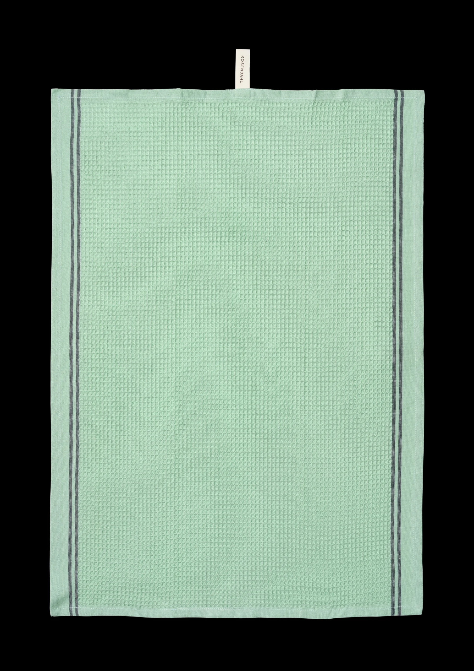 Rosendahl Textiles Alpha-viskestykket er fremstillet af 100% økologisk bomuld, GOTS-certificeret, og er kendetegnet ved den dybe tredimensionelle vaffeltekstur. Viskestykket måler 50×70 cm og er her i farven mint med sidestriber i mørkegrå. Rosendahls køkkentekstiler er ikke kun smukke at se på – de er også funktionelle, absorberer godt og tørrer hurtigt. Vi anbefaler at vaske dem ved 40 grader for at skåne miljøet, men de kan sagtens tåle at blive vasket ved 60 grader, uden at det går ud over kvaliteten. Rosendahl Textiles Alpha-viskestykket fås i flere farver.