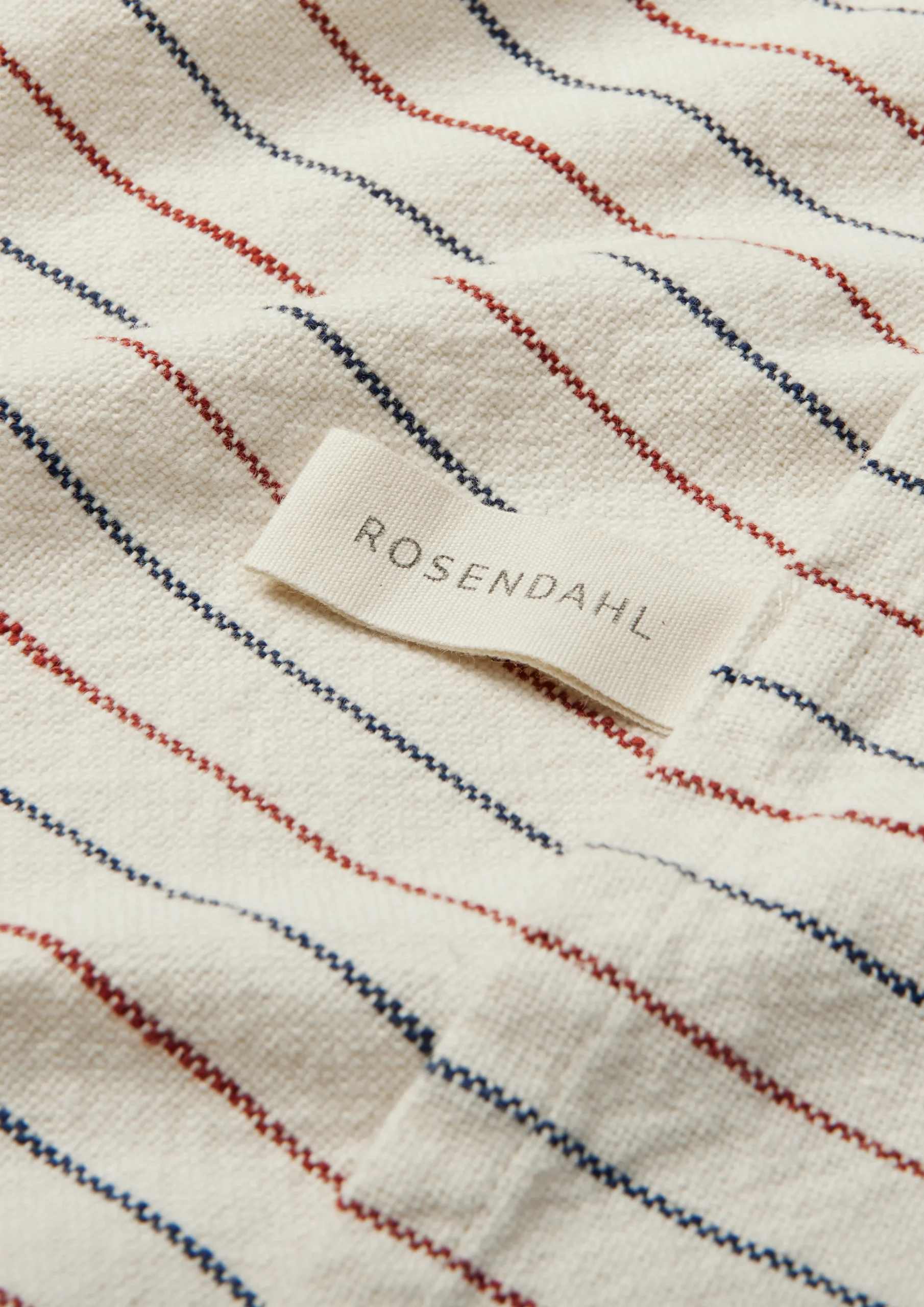 Få funktionalitet og farver ind i køkkenet med viskestykker i Rosendahl Textiles-serien. Mønstrene er variationer over klassiske køkkentekstiler, men med et moderne udtryk i kraft af farvevalget og den minimalistiske brug af tern og striber. Viskestykkerne har en både flot og funktionel vævning, hvor tråden twister og skaber den såkaldte cotton-slub-struktur, som giver et råt og rustikt udtryk og et viskestykke, der absorberer godt og tørrer hurtigt. Dette viskestykke måler 50×70 cm og er vævet med smalle striber i sæsonens blå og terracotta nuancer. Striberne står i smuk kontrast til grundfarven i sand, der bidrager til et roligt og jordnært udtryk. Viskestykket er fremstillet i et mix af genanvendt GRS-certificeret bomuld og genanvendt GRS-certificeret polyester, der garanterer en social og miljømæssig forsvarlig produktion. Rosendahl anbefaler at vaske viskestykkerne ved 40 grader for at spare på strømmen og skåne miljøet, men de kan sagtens tåle at blive vasket ved 60 grader, uden det går ud over kvaliteten. (GRS Certified by Control Union, CU1026087)